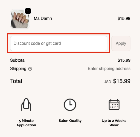 How do I apply a discount code to my order?Updated 10 days agoTo add a discount code to your order, please follow the steps below:On the checkout page, scroll down to the discount code box.Enter your code and click Apply. Was this article helpful? YesNo