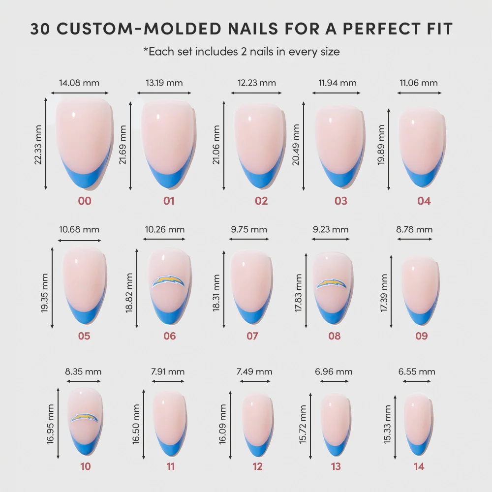 Los Angeles Chargers Press-On NailsUpdated 4 hours agoKey Features:Finish: Semi-Transparent | GlossyShape: Short AlmondLength: 15.25 - 22.2 mmWidth: 6.51 - 14.01 mm Thickness: 0.6 - 0.7 mm Was this article helpful? YesNo