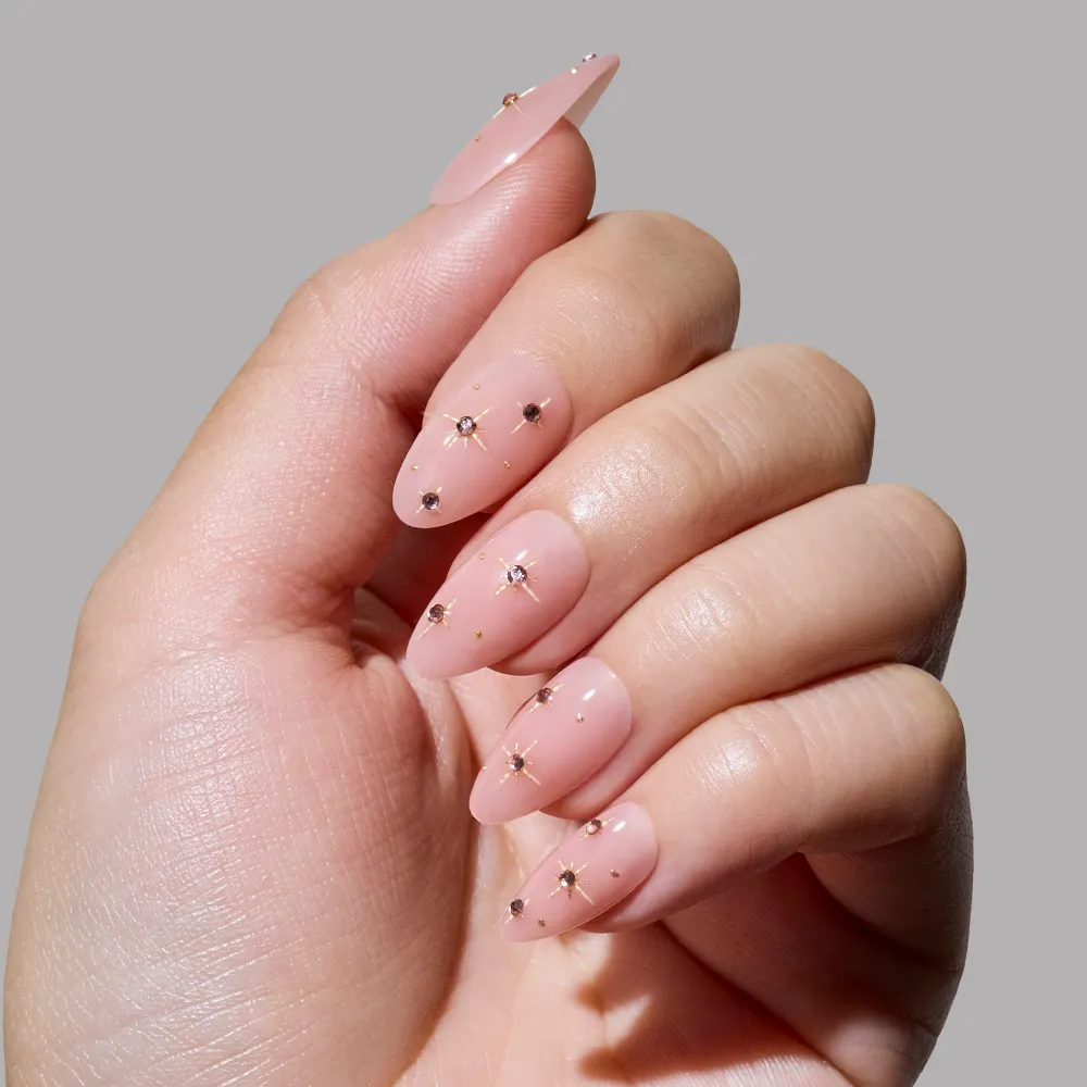 Nail Description: Pink Comet has a pink nude base with gold foil stars and raised lavender 3D gems for a soft, dreamy look. This is the pink twist of our best-selling North Star.
