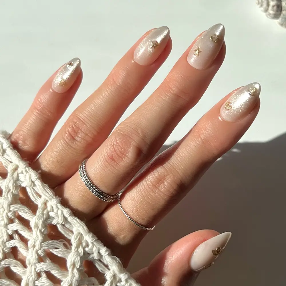 Sanded | Glossy | Velvet | Opaque | Nude to velvet finish tips with raised gold foil seashells and starfish | ![]() |