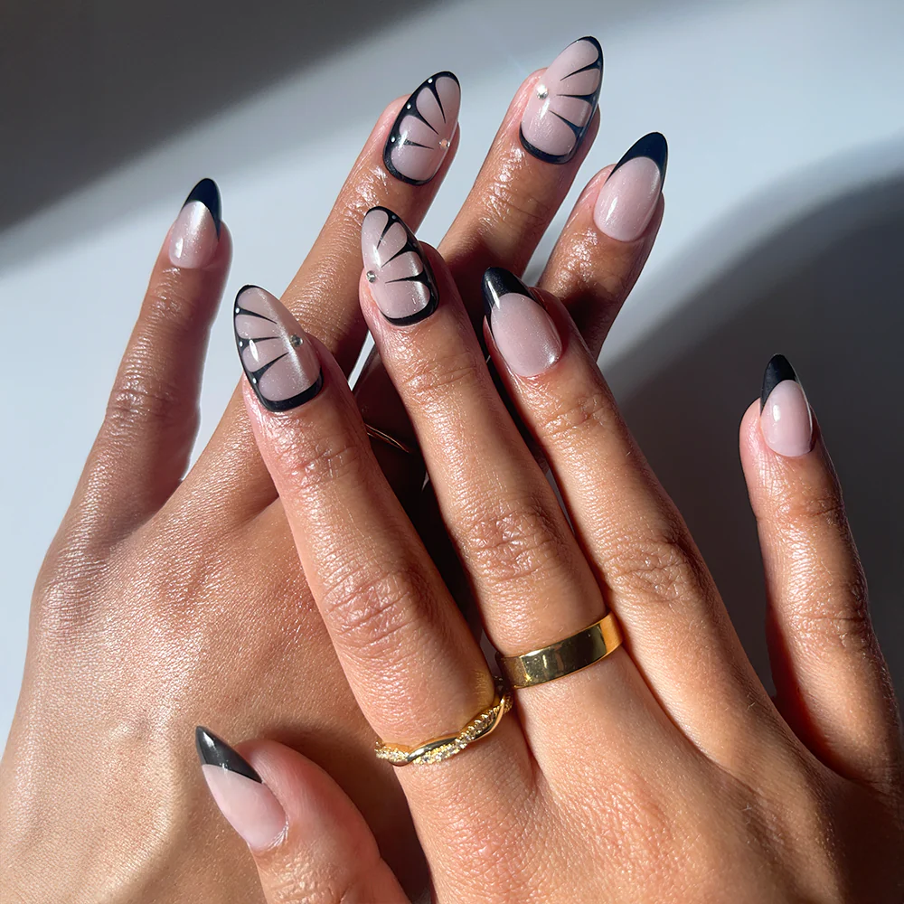 Butterfly Effect | Glossy | Velvet | Opaque | Nude velvet base with black french tips and butterfly accents (10 total) | ![]() |