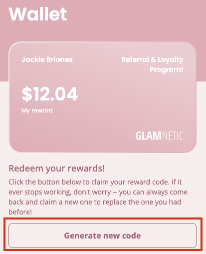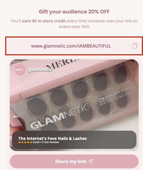 - Referral Link: This is the unique link you can share with friends, family, or anyone you’d like to invite to shop with Glamnetic. When a new customer uses your link on a purchase of over $50 USD, they get 20% off their first order, and you receive $5 USD in store credit.